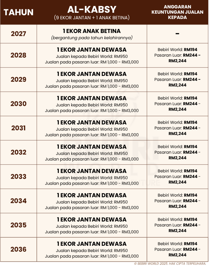 Selama 10 tahun secara berperingkat, induk ini akan mengawan dan kelahiran dari induk ini iaitu 9 ekor jantan adalah milik anda sepenuhnya. Jika induk ini melahirkan kembar 2 atau lebih pada tahun semasa, maka yang lebih itu adalah menjadi milik kami dan sebagai ganti kos operasi yang tuan/puan tidak perlu bayar.